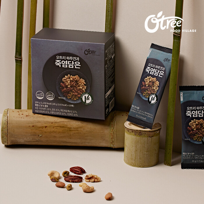 신제품 ‘오트리 하루견과 죽염담은’은 죽염아몬드, 죽염캐슈넛, 호두, 미국산 하이올레익 땅콩, 구운 피스타치오, 구운피칸 6종 순수견과로 이루어져 있다.