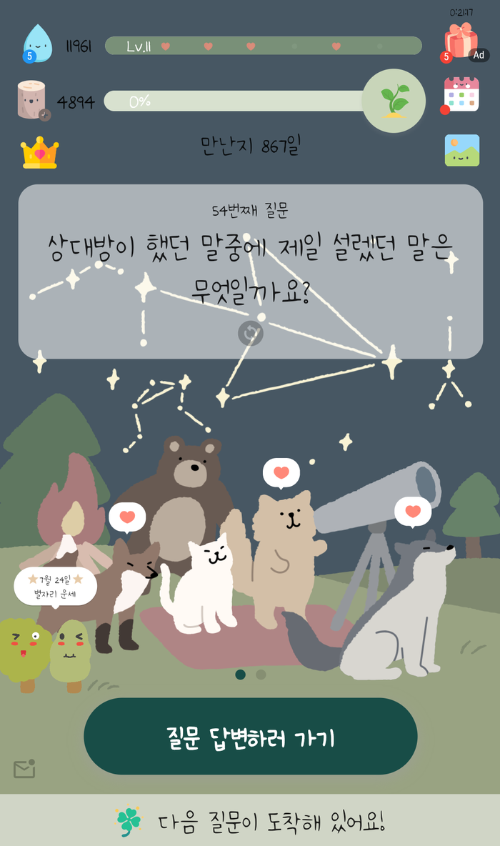 이번 업데이트에서는 기존의 연인들의 대화를 바탕으로 귀여운 동물이 상담을 제공하는 AI 카운셀러 기능을 제공한다. 생일을 통해 오늘의 별자리를 분석할 수 있는 기능부터, 연인끼리 데이트 및 대화에 꼭 필요한 카운셀러 기능이 업데이트 되어서 더욱 더 다양한 커플 컨텐츠를 즐길 수 있게 되었다.