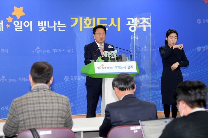 | ▲ 강기정 광주광역시장이 15일 오후 시청 브리핑룸에서 덕남정수장 수돗물 유출사고과 관련해 브리핑을 하고 있다./광주광역시 제공 |