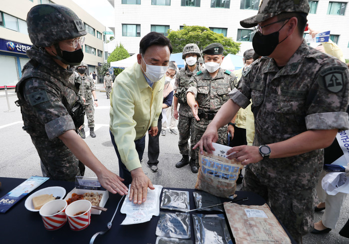 서울 강남구는 최근 2022 을지연습의 일환으로 ‘군(軍 )장비 및 물자전시회’를 개최했다. 행사에는 52사단장 비롯해 재향군인회 등이 참석해 군 전술 차량, 대공무기 신궁, 정찰 드론 등을 참관했다. 사진은 조성명 구청장(왼쪽 두번째)이 전투식량을 살펴보고 있는 모습.(사진제공=강남구청)
