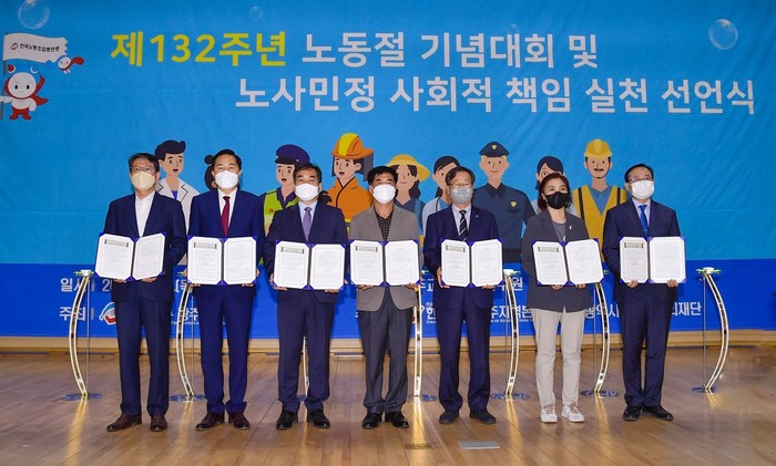 [광주=정찬남 기자] 조인철 광주광역시 문화경제부시장(왼쪽 첫번째)이 28일 오후 북구 교통문화연수원 대강당에서 열린 '2022 노동절 기념대회 및 노사민정 사회적 책임 실천 선언식'에 참석해 김용집 광주시의회 의장, 윤종해 한국노총광주지역본부 의장 등 내빈들과 선언문을 들고 기념촬영을 하고 있다./광주광역시 제공