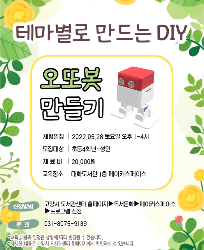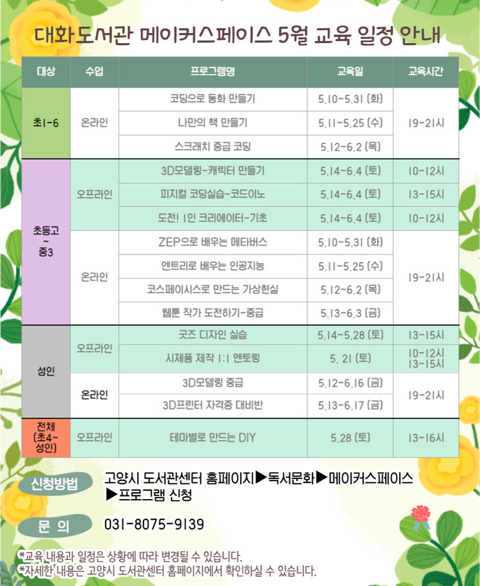 [고양=이기홍 기자] 고양시 대화도서관이 4월 26일부터 ‘메이커스페이스 5월 교육 프로그램’ 수강생을 모집한다.