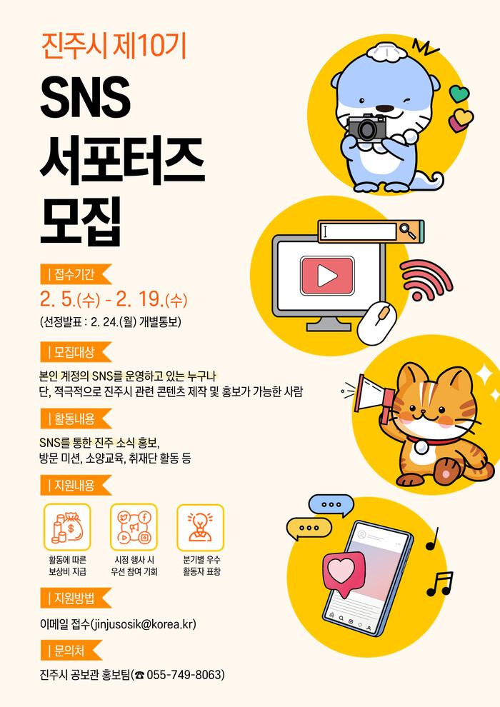 진주시는 공식 SNS 콘텐츠 제작과 홍보에 참여할 ‘제10기 진주시 SNS 서포터즈’를 2월 5일부터 19일까지 15일간 모집한다고 밝혔다.