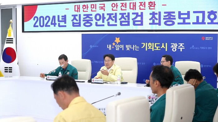 | ▲ 강기정 광주광역시장이 21일 오후 시청 충무시설에서 열린 2024년 집중안전점검 최종 보고회에 참석해 회의를 주재하고 있다. / 광주광역시 제공 |