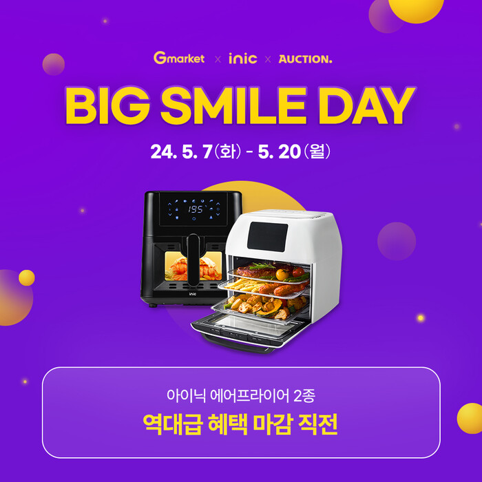 한편, 아이닉이 참여한 ‘빅스마일데이’는 오늘(20일) 자정까지 진행되며, 이번 행사에서 아이닉 에어프라이어를 최대 60%까지 할인된 가격으로 만나 볼 수 있다.