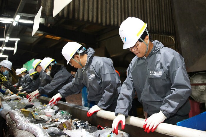 | ▲ 금천구의회 의원들이 자원재활용처리장 현장에서 선별작업을 하고 있다. (사진= 금천의회 제공) |