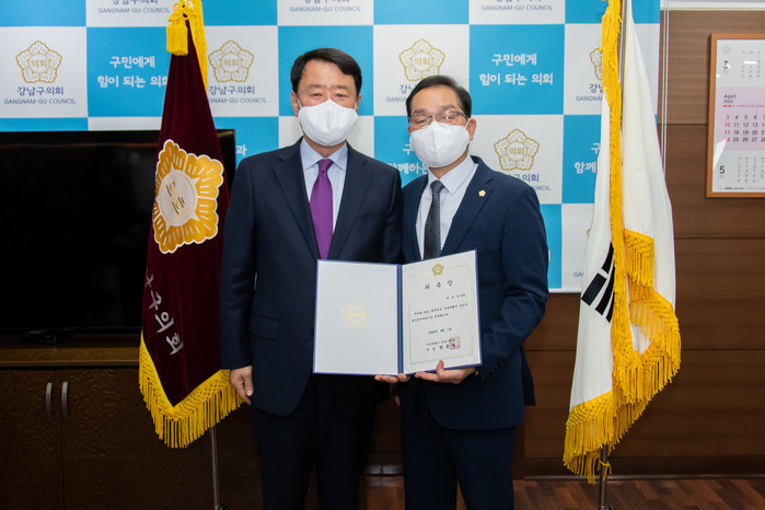 | ▲ 지난 1일 의장실에서 한용대 의장이(왼쪽) 복진경 의원에게 결산검사 위원 위촉장 수여하고 있다.(사진제공=강남구의회) |