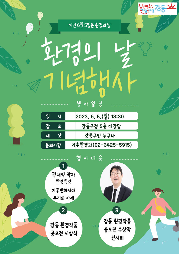 또한 특강에 앞서, ‘2023 강동 환경작품 공모전’ 수상자 표창 및 수상작 전시회를 진행한다. 총 417건의 응모작 중 최종 선정된 40건의 작품을 통해 미래세대 주역인 학생들의 환경에 대한 고민과 생각을 엿볼 수 있다.