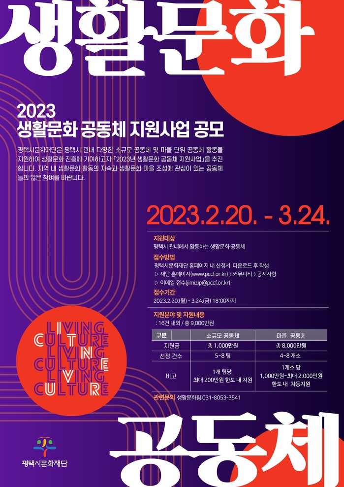 평택시문화재단(대표이사 이상균)은 평택시 생활문화 진흥과 지역 내 공동체 활성화를 위해 「2023년 생활문화 공동체 지원사업」공모한다고 밝혔다.
