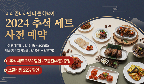 18만원대 상당의 세트 메뉴를 사전 구매 고객에 한하여 할인된 가격에 구매할 수 있으며, 여기에 추석 세트를 구매하는 모든 고객에게 모둠전 4종을 추가로 증정한다.