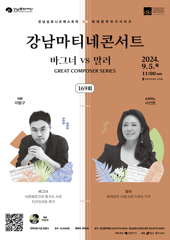 강남심포니가 준비한 9월의 강남마티네콘서트에서는 국내에서 쉽게 감상할 수 없는 바그너와 말러의 숨겨진 명곡들을 만나볼 수 있다. 작곡가 바그너의 유일한 희극 오페라인 <뉘른베르크의 명가수> 서곡과 평화롭고 따스한 분위기에 다채로운 선율이 더해져 찬란하게 울려 퍼지는 작품인 <지크프리트 목가>를 만나본 후 소프라노 서선영의 환상적인 음색으로 작곡가 말러의 <뤼케르트 시에 의한 5개의 가곡>을 감상할 수 있다.