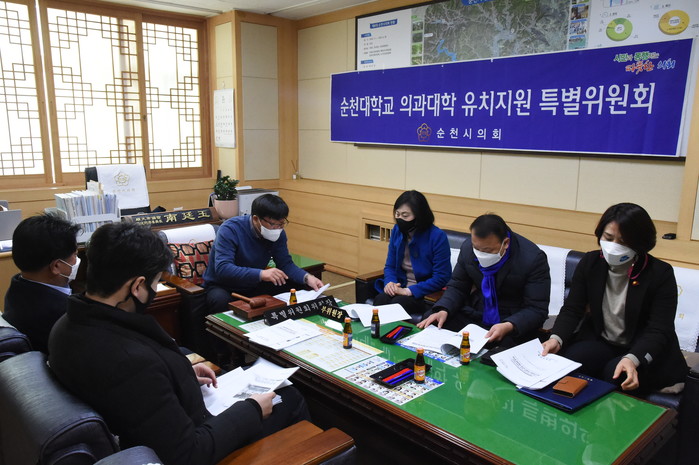 | ▲‘순천대학교 의과대학 유치지원 특별위원회’ 위원들이 회의를 하고 있다. (사진제공=순천시의회) |