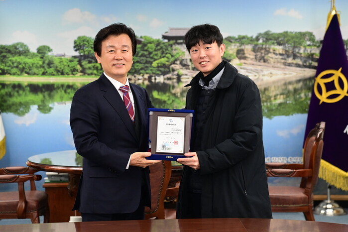 [진주=엄기동 기자] 진주시는 지난 10일 시청 기업인의 방에서 김명훈 국립진주박물관 학예사에게 진주시 명예시민증을 수여했다.