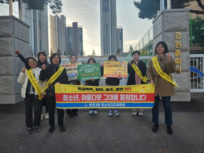 [시민일보 = 이대우 기자] 서울 서초구(구청장 전성수) 반포3동주민센터가 경원중학교 및 지역 청소년들을 대상으로 ‘청소년, 아름다운 그대를 응원합니다’ 청소년 선도·보호 캠페인을 진행했다.
