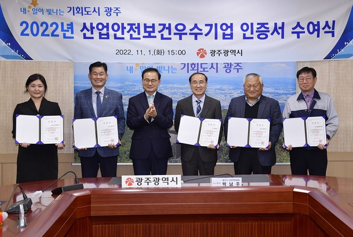 광주광역시는 이 사업에 선정된 우수기업 5곳에 대해 1일 시청에서 ‘2022년 산업안전보건 우수기업’ 인증서와 현판을 수여했다.