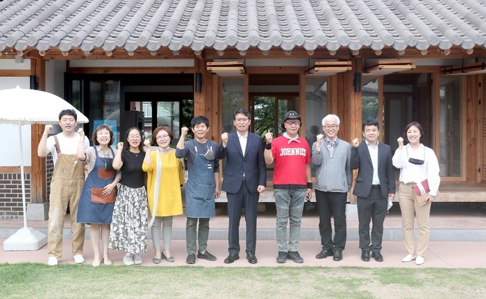 [광주=정찬남 기자] 조인철 광주광역시 문화경제부시장이 15일 오후 남구 양림동 펭귄마을 내 공예특화거리 입주공방을 둘러본 후 입주 공예인들과 기념촬영을 하고 있다./광주광역시 제공