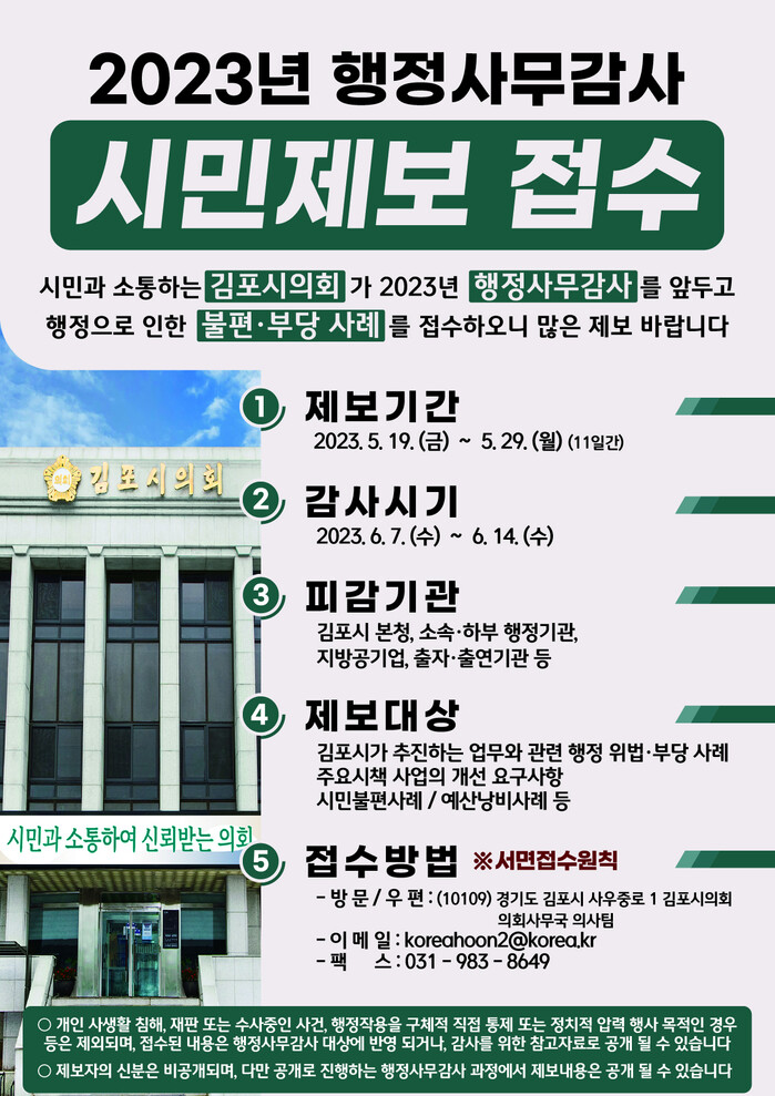 [김포=문찬식 기자] 경기 김포시의회가 ‘2023년도 행정사무 감사’를 앞두고 이달 19~29일 11일간 시민제보를 접수받는다.