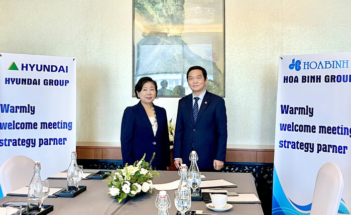 | ▲ 현정은 현대그룹 회장은 22일(현지시간) 레 비엣 하이(Le Viet Hai) 호아빈 건설그룹 회장과 만나 베트남 경제 상황을 논의하고, 건설 산업 협력을 논의했다. 왼쪽부터 현정은 회장과 레 비엣 하이 회장. (사진=호아빈건설그룹) |