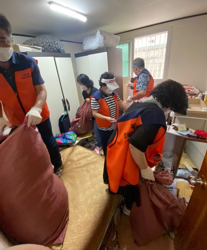 서울 중랑구는 최근 지역내 치매와 저장강박증으로 집안이 온갖 잡동사니로 가득 차 질병에 노출되기 쉬운 환경에 놓인 저소득 홀몸노인 가정을 대상으로 대청소와 방역 활동 등을 진행했다. 사진은 봉사자들이 대청소를 진행하고 있는 모습.(사진제공=중랑구청)