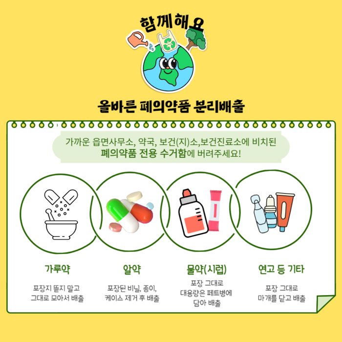 폐의약품을 올바르게 처리하려면 ▲포장지 제거 후 알약들만 모아 배출(알약) ▲포장지 그대로 배출(가루약) ▲병에 모아 배출(물약 등 시럽제) ▲용기 그대로 배출(연고, 스프레이, 안약 등) 종류에 따라 분류해 폐의약품 수거함에 버리면 된다.