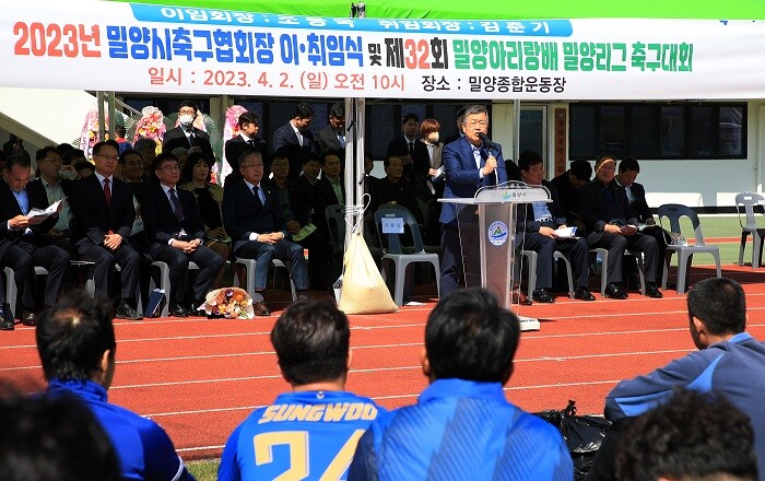 [밀양=최성일 기자] 밀양시축구협회는,지난 2일 밀양종합운동장에서 제3·4대 밀양시축구협회장 이·취임식 및 제32회 밀양아리랑배 밀양리그 출발을 알렸다.