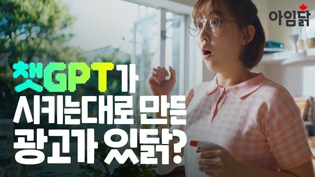 아임닭은 챗GPT에게 ‘아임닭 광고 콘티 재밌게 짜줘’, ‘마케팅 타겟은 자취생, 아이 엄마, 직장인이야’라고 요청해 챗GPT가 내놓은 답변을 그대로 광고에 담았다. 등장인물, 지문, 대사 등 광고의 모든 부분을 인공지능이 쓴 대본으로 각색이나 수정 없이 연출하고 촬영까지 해 아임닭이 국내 최초 타이틀을 거머쥐었다.