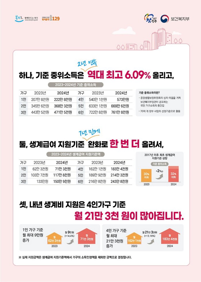 [진주=엄기동 기자] 진주시는 2024년도 기준 중위소득(4인 가구)을 6.09% 인상하고 생계급여 기준(4인 가구)을 역대 최대인 13.16% 인상한다고 밝혔다.