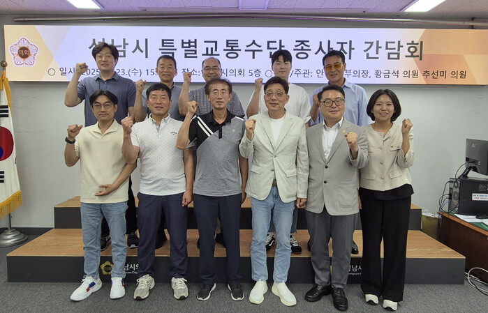 [성남=오왕석 기자] 성남시의회 안광림 부의장(성남동, 하대원동, 도촌동), 황금석 의원(상대원1동, 상대원2동, 상대원3동), 추선미 의원(중앙동, 금광1·2동, 은행1·2동)이 공동주최ㆍ주관한 ‘특별교통수단(복지택시) 종사자와 함께하는 간담회’가 2025년 7월 23일(수), 성남시의회 5층 회의실에서 열렸다.