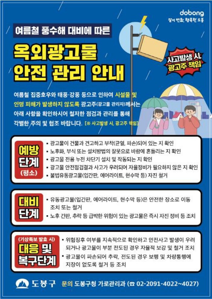 [시민일보 = 여영준 기자] 도봉구(구청장 오언석)가 8~9월 대대적인 옥외광고물 안전관리에 나선다. 호우, 태풍이 많은 이 기간 주민의 안전사고를 예방하기 위해서다.