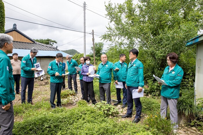 | ▲ 이송옥 해남군의회 의장(오른 쪽부터 네 번째)과 군의원 등이 지난 17일 폭우로 주택 침수 피해를 입은 현산면 등 남부 지역 피해현장을 방문해 피해 상황을 점검하고 있다. / 해남군의회 제공 |