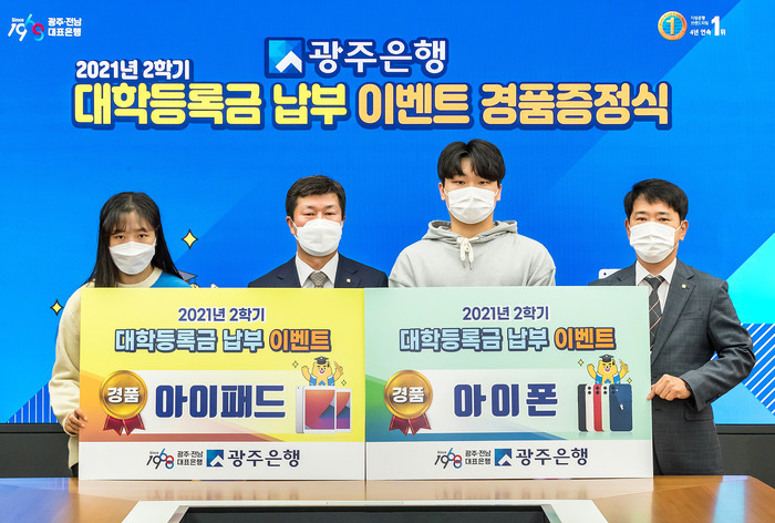 [시민일보 = 이대우 기자] 광주은행(은행장 송종욱)은 ‘2021년 2학기 대학등록금 납부 이벤트’의 당첨자를 발표하고, 등록금 납부 이벤트의 당첨고객 2명을 본점에 초청해 경품 증정식을 열었다.