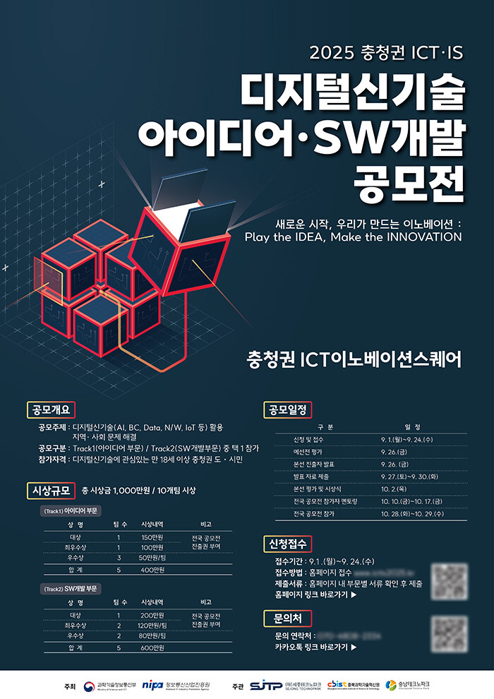 더불어, 충청권 ICT이노베이션스퀘어 관계자는 “이번 공모전은 디지털 신기술을 기반으로 한 창의적 아이디어와 실질적 SW개발 역량을 발휘할 기회”라며 “충청권 ICT 생태계와 지역 혁신에 기여할 수 있는 다양한 인재들의 많은 참여를 기대한다”고 밝혔다.