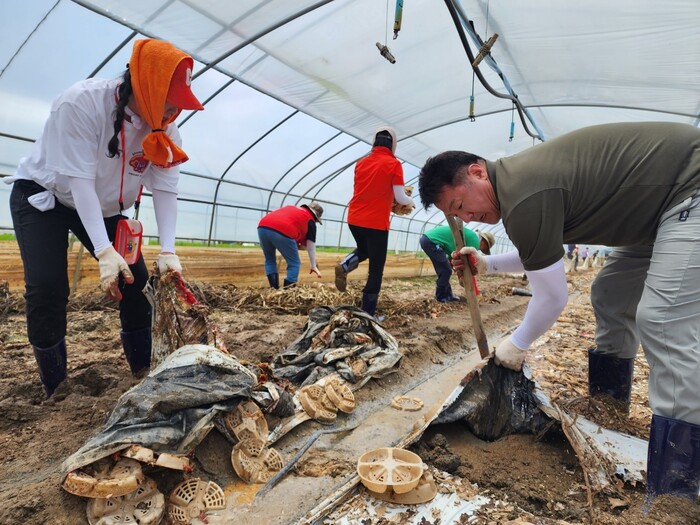 이번 수해로 완전 침수된 익산의 수박농장 비닐하우스를 찾아 피해 작물을 수거하고 폐비닐을 제거한 후 농사 용품 등을 정리했다.