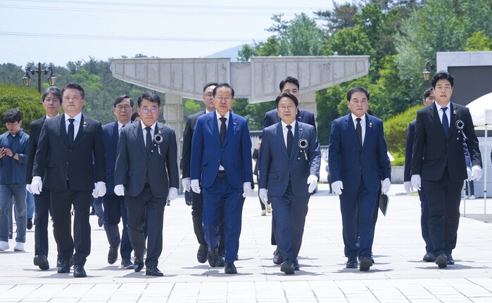 | ▲ 강기정 광주광역시장과 홍준표 대구광역시장이 제44주년 5·18민주화운동 기념식을 하루 앞둔 17일 오전 북구 운정동 국립5·18민주묘지를 찾아 참배를 위해 묘역으로 향하고 있다./광주광역시 제공 |