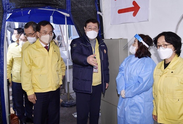 [광주=정찬남 기자] 이용섭 광주광역시장이 설 명절을 앞두고 26일 오후 광산구 선별진료소를 방문해 코로나19 새 방역체계를 점검하고 의료진과 봉사자 등을 격려하고 있다.