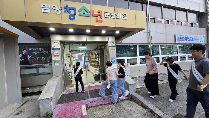 | ▲ - 밀양시 내일동에서 청소년 지도위원회 위원들과 청소년 유해환경 예방 홍보를 위해 청소년 문화의 집을 방문하고 있다. |