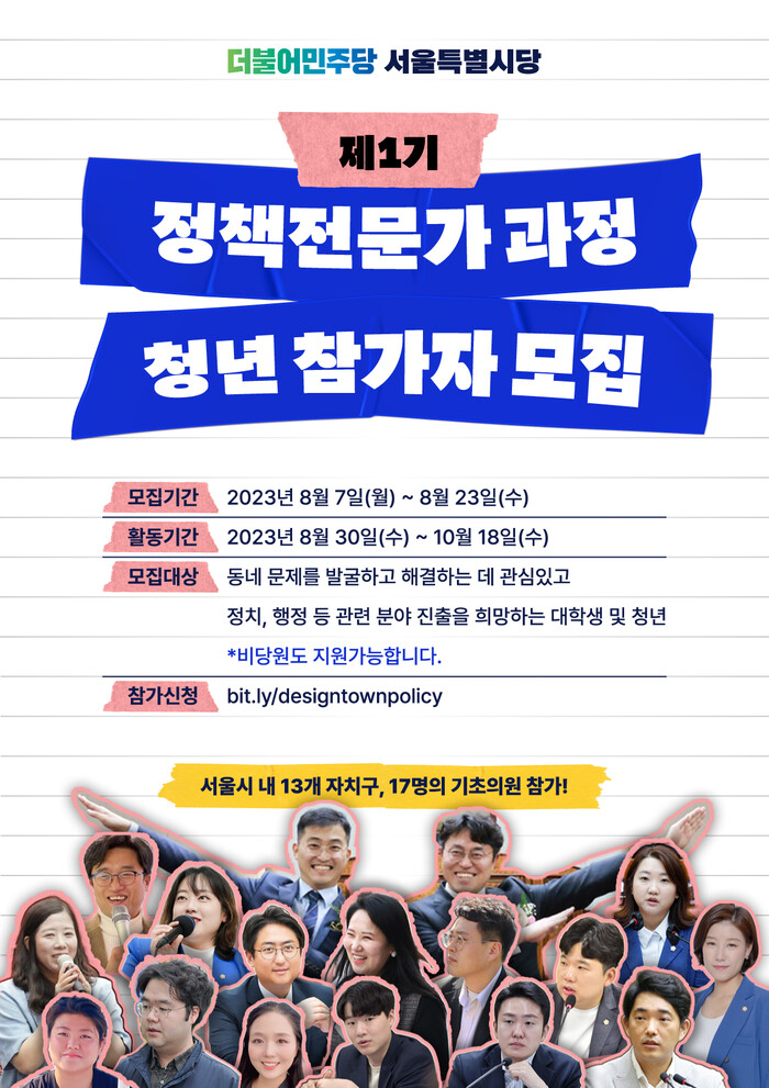 우리 동네의 문제를 발굴하고 해결하는 데 관심이 있거나, 정치·행정 등 관련 분야의 진출을 희망하는 서울시 거주 또는 활동하는 대학생 및 청년(34세 이하) 이라면 당원 여부와 관계없이 누구든 지원할 수 있으며 모집 기간은 23일까지, 참가자 발표는 25일 개별 통보된다.