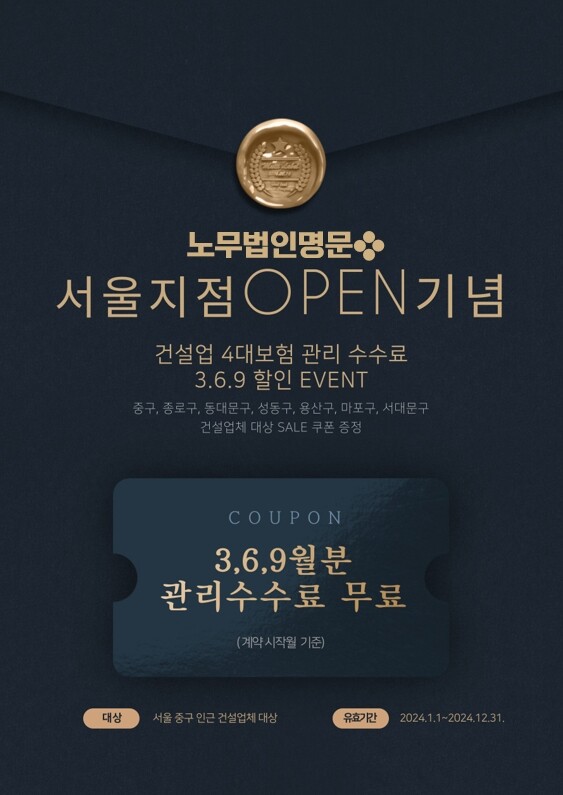 이 특별 이벤트는 노무법인명문 서울지점의 개소를 기념하여 지역사회의 건설업체들에게 실질적인 혜택을 제공하고, 건설일용직 4대보험 관리 서비스에 대한 인식을 높이기 위해 마련되었다. 이번 할인 이벤트는 중구 및 주변 구역에 위치한 건설업체들에게 노무법인명문의 전문적인 서비스를 할인된 비용으로 체험 할 수 있는 기회를 제공한다.