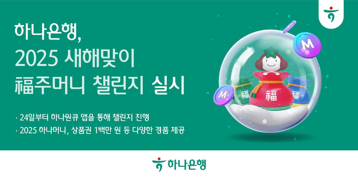 [시민일보 = 여영준 기자] 하나은행은 2025년 을사년(乙巳年) 새해를 맞아 손님들께 풍성한 혜택을드리는 '2025 새해맞이 복(福)주머니 챌린지'를 실시한다고 24일 밝혔다.