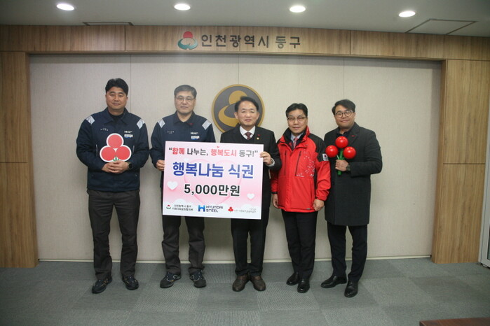 17일 인천 동구청에서 이성재 현대제철 인천공장장, 김찬진 인천 동구청장, 박용훈 인천사회복지공동모금회 사무처장, 오병규 인천동구지역사회보장협의체 오병규 위원장 등이 참석, 행복 나눔 식권 전달식이 개최됐다.