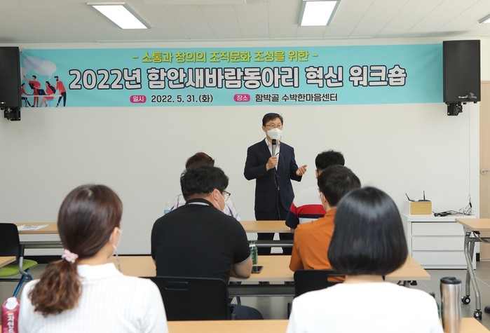 함안군은 지난 31일 대산면 함박골 수박한마음센터에서 함안군의 혁신 멤버들로 구성된 함안새바람동아리 회원 30여명이 참여한 가운데 ‘조직문화 혁신 워크숍’을 개최했다.