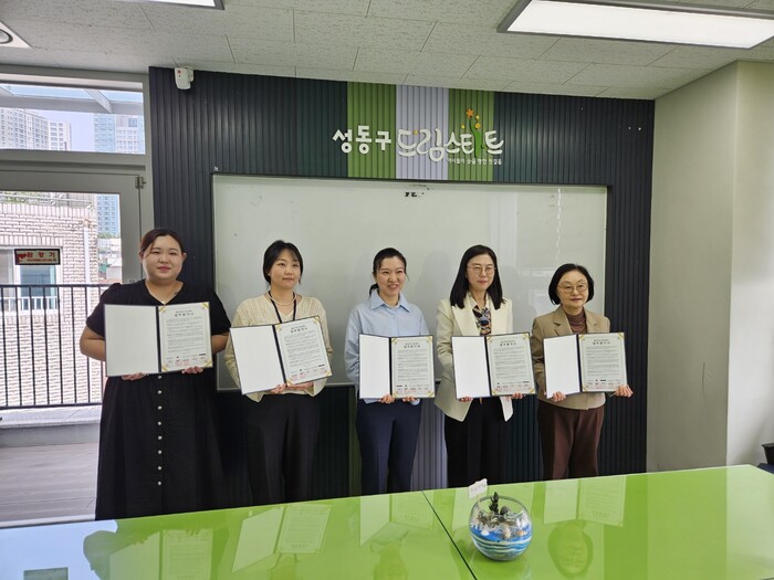 | ▲ 성동구가 드림스타트 가정 맞춤형 가족 지원 프로그램인 ‘무지개 가족 테라피’를 오는 7월 말까지 운영한다. 사진은 무지개 가족 테라피를 위한 관계기관 협약 모습. (사진=성동구청 제공) |