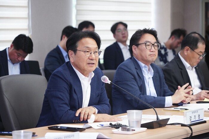| ▲ 강기정 광주광역시장이 11일 오후 서구 한국은행광주전남본부에서 열린 ‘지역 금융권 및 유관기관 간담회’에 참석해 지역기업 소상공인 대출금리와 지원사업 협력방안을 논의 하고 있다./광주광역시 제공 |