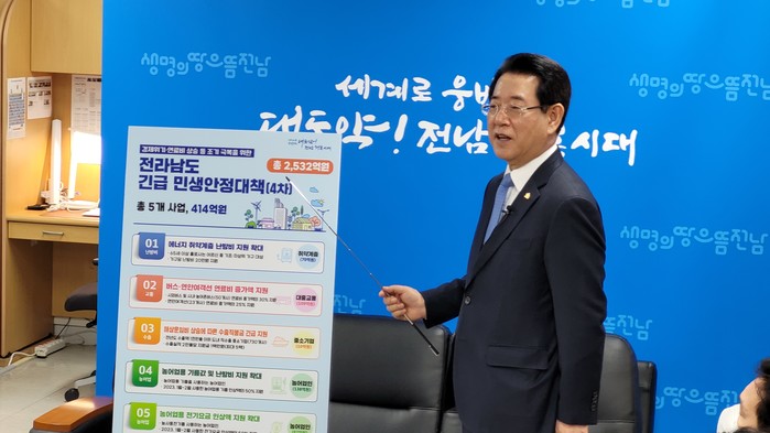 [남악=황승순 기자]김영록 전라남도지사는 15일 도청 지방기자실에서 기자간담회를 열어 고물가와 경기침체, 전기세.유류비 상승 등으로 어려운 도민을 위한 긴급 민생안정대책을 발표, 예비비 등 414억 원을 긴급 지원한다고 밝혔다.