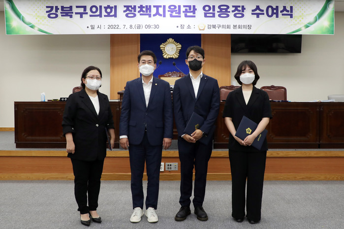[시민일보 = 박준우 기자] 서울 강북구의회는 최근 본회의장에서 신규 임용된 3명의 정책지원관(일반임기제공무원 7급)들에게 임용장을 수여했다.