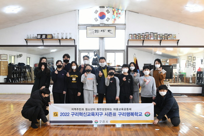 지난 3일 안승남 구리시장은 2022 구리 행복학교(검도학교)를 방문해 수업에 참관하는 등 학생들과 함께 땀을 흘렸다. 구리 행복학교는 청소년과 지역주민이 동방성장을 통해 만들어가는 행복한 지역사회 배움터로, 지역내 초·중학교 청소년들을 대상으로 8개의 종목으로 운영한다. 사진은 안승남 구리시장이(오른쪽 일곱번째) 2022 구리 행복학교을 방문해 학생들과 기념촬영을 하고 있는 모습.(사진제공=구리시청)