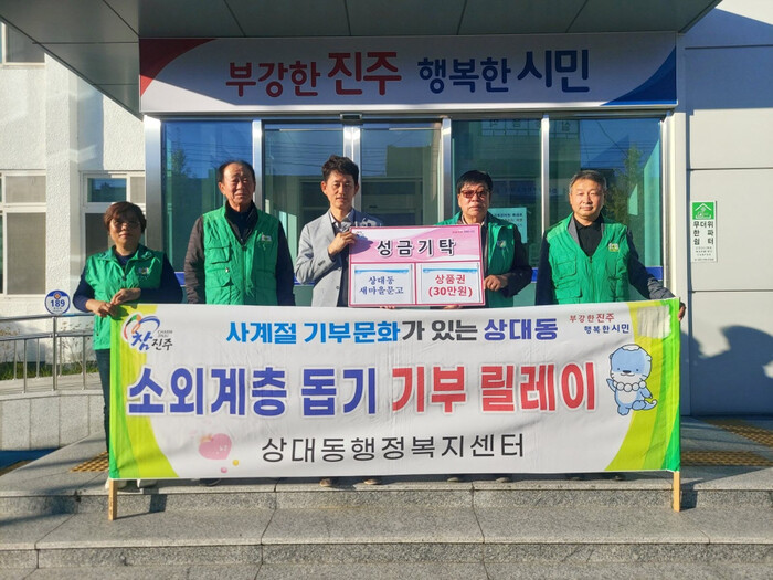 진주시 상대동은 2017년부터 상대동 봉사단체협의회(회장 허근도)와 함께 소외된 이웃을 돕기 위한 특수시책으로 기부릴레이‘사계절 기부문화가 있는 상대동’을 시행하고 있다.