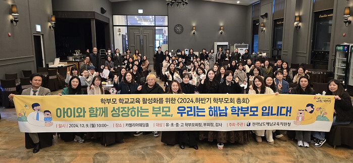 [해남=정찬남 기자] 전라남도해남교육지원청(교육장 이자영)은 9일(월) 김대중 전라남도교육감을 비롯해 관내 유ㆍ초ㆍ중ㆍ고 학부모회장, 부회장, 감사 100여 명이 참여한 가운데 해남군 카멜리아웨딩홀에서 ‘2024학년도 하반기 해남 학부모회 총회’를 개최했다.