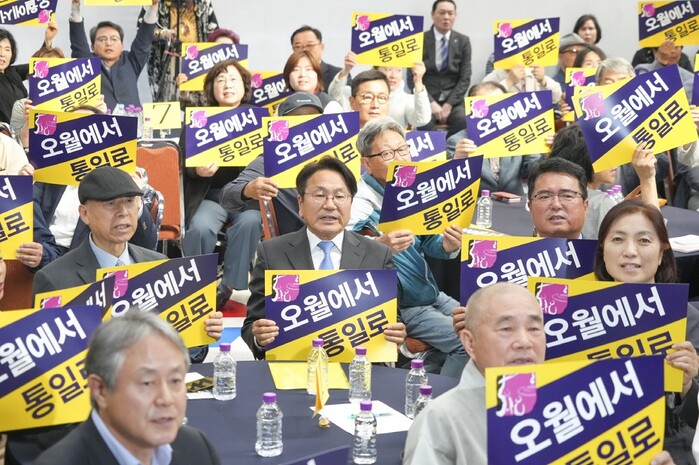 | ▲ 강기정 광주광역시장(사진 가운데)이 16일 오후 동구 광주YMCA 무진관에서 열린 ‘2024 민족평화포럼’에서 참석자들과 “오월에서 통일로”를 외치고 있다./광주광역시 제공 |