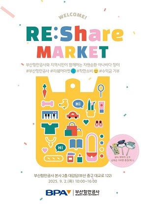 [부산=최성일 기자] 부산항만공사(BPA, 사장 송상근)가 9월 2일(화) 오전 10시부터 오후 4시까지 BPA 본사 2층 대강당(부산시 중구 대교로 122)에서 나눔과 자원순환 문화를 확산하기 위한 ‘BPA RE:Share 마켓’을 개최한다.